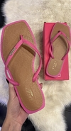 Descrição: Chinelo de dedo rosa. O modelo tem sola rasteira flat injetada de PVC e palmilha lisa marrom. De bico redondo, traz tiras finas injetadas, dividindo os dedos, e com inscrição do nome da marca em uma delas. Aberto, o chinelo de dedo exibe todo o pé.